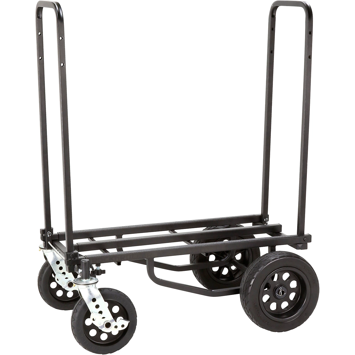 The R12STEALTH is the flagship of the RocknRoller Multi-Cart line. It features rugged, foam-filled no-flat 10″ rear wheels and 8″ front casters that are designed to navigate just about any terrain with ease, including gravel, grass, or other uneven surfaces. The R-Trac tires ride smoothly with excellent traction, similar to pneumatic tires, but without the hassle of upkeep or repair. The patented 8-in-1 cart can transform easily to adjust to various load sizes, allowing you to move large amounts of gear in no time at all. Extending from 34″ to 52″ in length, the R12STEALTH has a weight capacity of 500 lbs, but also folds small for storage or transport in a vehicle. The textured powder coated steel is durable and also reduces slippage during transport.